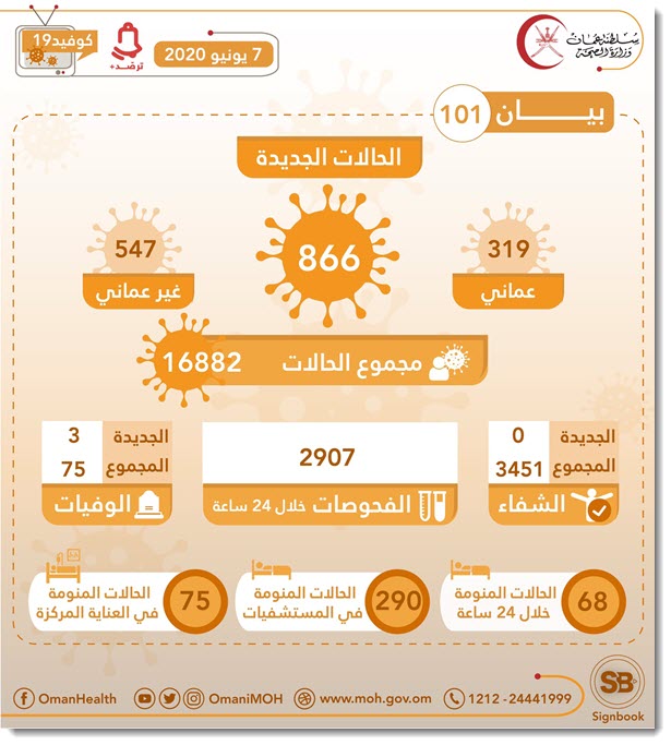 ولفتت الوزارة في بيانها، إلى أن الحالات الجديدة منها 319 حالة لعُمانيين، و547 حالة لغير عُمانيين.