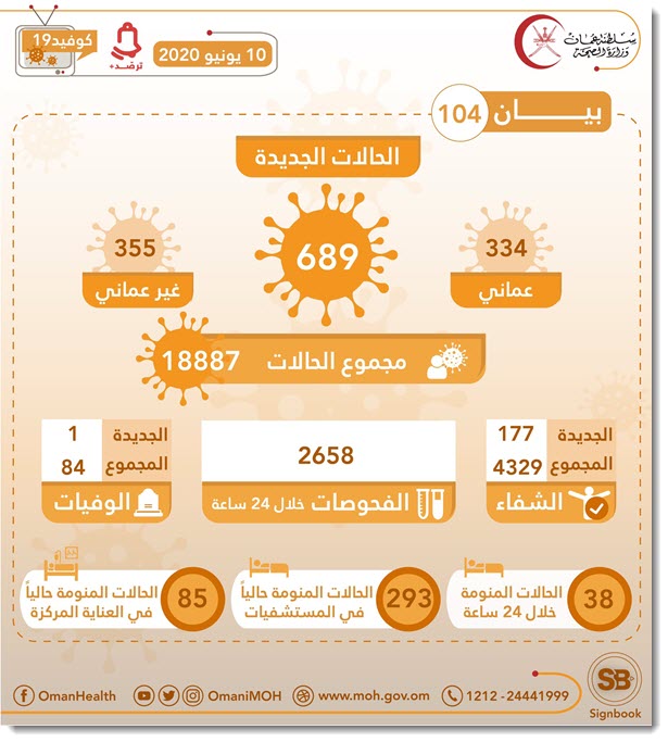 مباشر: أعلنت وزارة الصحة في سلطنة عُمان عن تسجيل 689 حالة إصابة جديدة بفيروس كورونا "19-Covid".