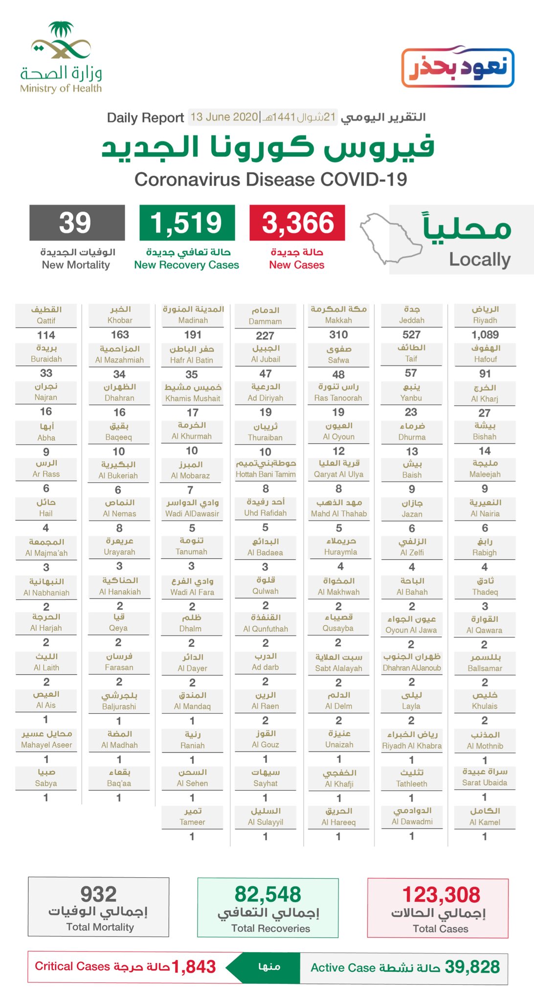 وبينت الوزارة، أن إجمالي الإصابات في المملكة بفيروس كورونا وصل لـ123.308 حالات، في حين تعافى 82.548 حالة من الفيروس، ووصلت أعداد الوفيات لـ932 حالة.