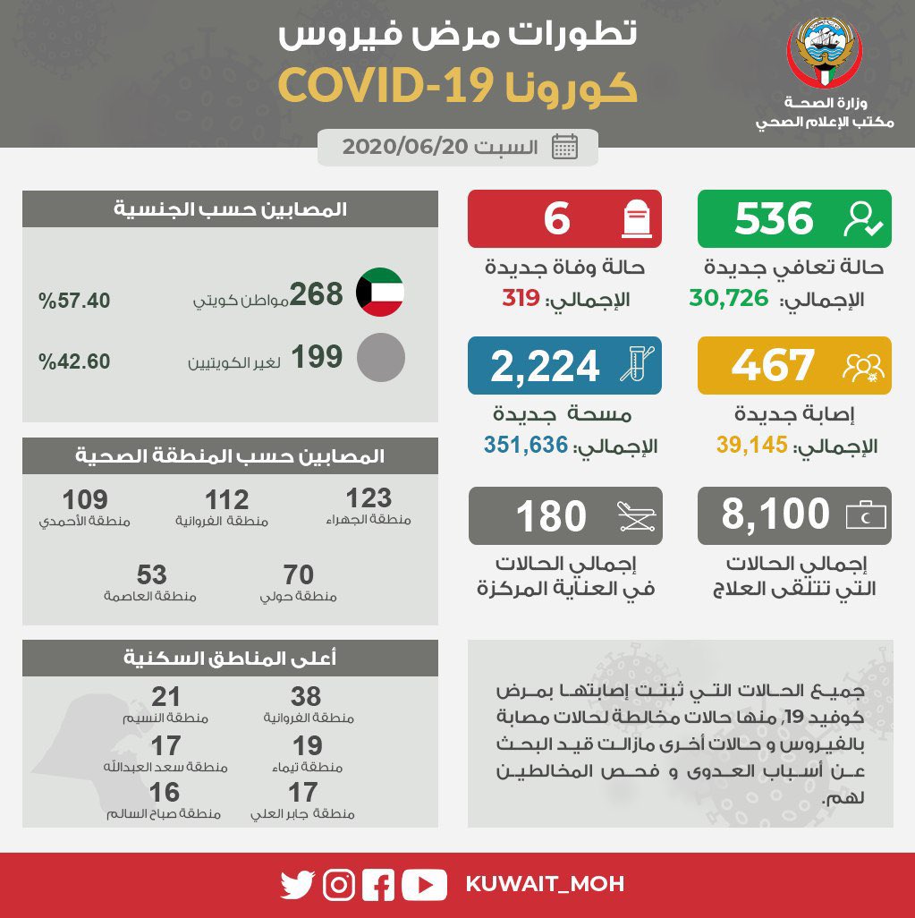 الكويت - مباشر: أعلنت وزارة الصحة في الكويت عن تسجيل 467 إصابة جديدة بفيروس كورونا، و6 حالات وفاة.
