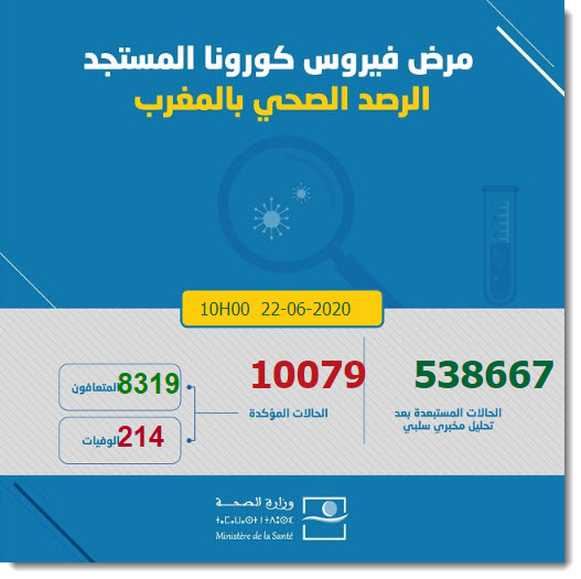 وجاءت إحصاءات وزارة الصحة المغربية، على بوابتها الرسمية، حول مصابي فيروس كورونا خلال الساعات الأخيرة، ليرتفع العدد الإجمالي لحالات الإصابة المؤكدة بالفيروس بالمملكة إلى 10.079 ألف حالة.
