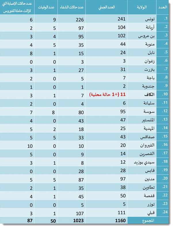 وتوزعت الإصابات وحالات الوفاة بين الولايات التونسية كالتالي..