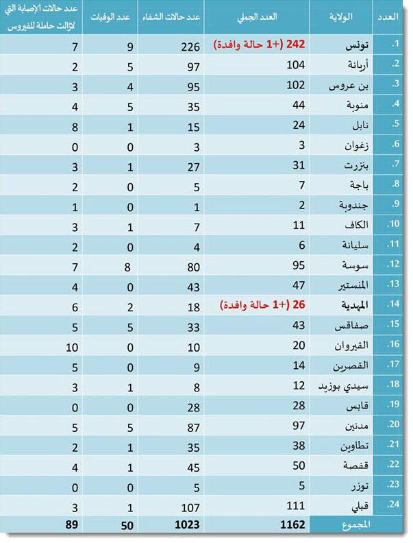 وتوزعت الإصابات وحالات الوفاة بين الولايات التونسية كالتالي..