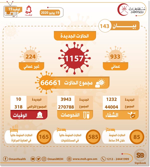 ولفتت الوزارة في بيانها، إلى أن الحالات الجديدة منها 933 حالة لعُمانيين، و224 حالة لغير عُمانيين.
