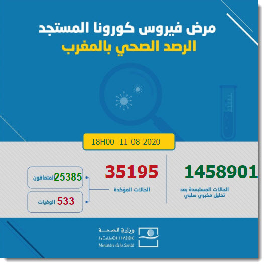 وجاءت إحصاءات وزارة الصحة المغربية، على بوابتها الرسمية، اليوم الأربعاء، حول مصابي فيروس كورونا خلال 24 ساعة، ليرتفع العدد الإجمالي لحالات الإصابة المؤكدة بالفيروس بالمملكة إلى 35.195 ألف حالة.