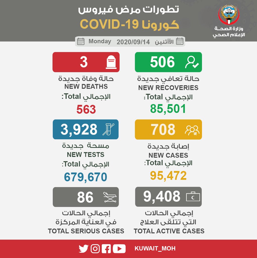 الكويت - مباشر: أعلنت وزارة الصحة الكويتية اليوم الاثنين، تسجيل 708 حالة جديدة مؤكدة الإصابة بفيروس كورونا (كوفيد 19).