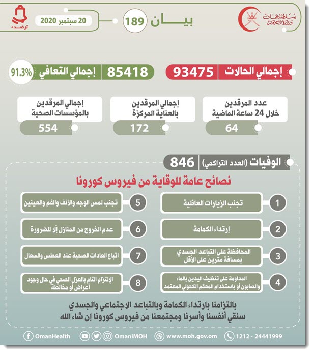 مباشر: أعلنت وزارة الصحة في سلطنة عُمان عن تسجيل 1.722 ألف حالة إصابة جديدة بفيروس كورونا "19-Covid".
