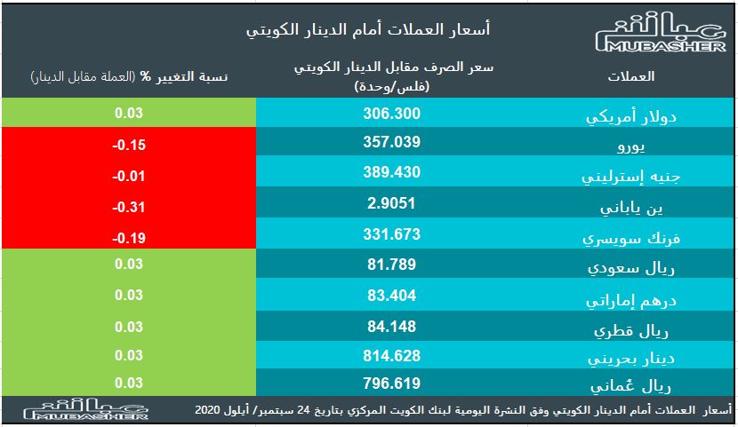 وفيما يلي جدول يعرض أسعار صرف بعض العملات العربية والأجنبية مقابل الدينار، وفق النشرة اليومية لبنك الكويت المركزي: