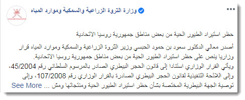 مباشر: قررت عُمان حظر استيراد الطيور الحية من بعض مناطق جمهورية روسيا الاتحادية.