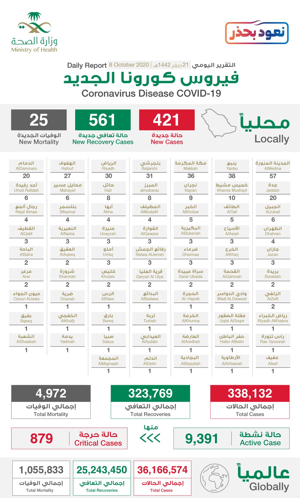 كما نوهت وزارة الصحة السعودية إلى أن عدد الإصابات عالمياً بلغ 36.17 مليون إصابة، بينما بلغ عدد حالات التعافي 25.24 مليون حالة، وبلغ عدد الوفيات 1.06 مليون حالة.