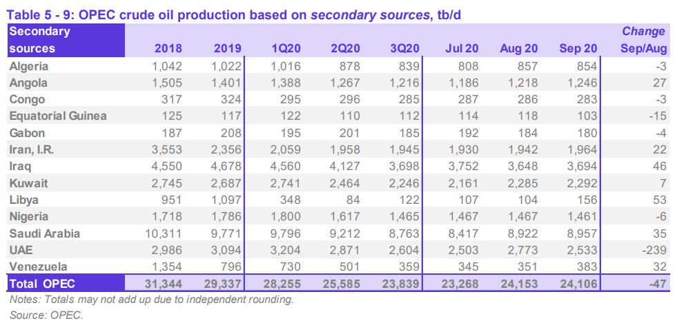 وبشكل عام، تراجع إنتاج منظمة البلدان المصدرة للنفط في الشهر الماضي 47 ألف برميل، ليصل إلى 24.206 مليون برميل يومياً، مقارنة بـ24.253 مليون برميل يومياً في أغسطس/آب 2020.