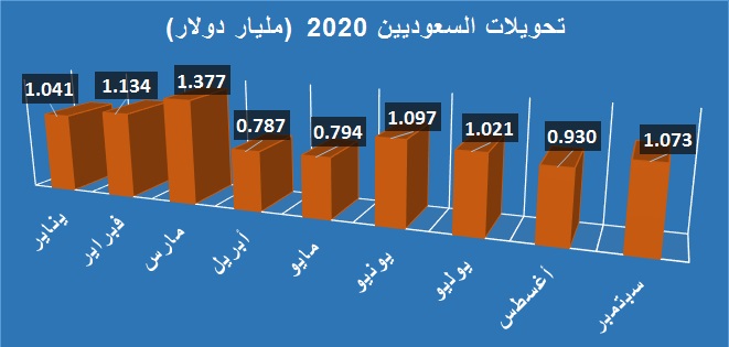 وسجلت تحويلات السعوديين انخفاضاً في الـ9 أشهر الأولى من عام 2020 بنحو 17.4% على أساس سنوي، وبتراجع قيمته 7.3 مليار ريال (1.95 مليار دولار) عن الفترة المماثلة من العام الماضي، وفقاً لحسابات "مباشر".