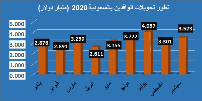 وخلال سبتمبر/ أيلول الماضي، ارتفعت التحويلات بنسبة 28.6% على أساس سنوي إلى 13.21 مليار ريال (3.52 مليار دولار)، مقارنة مع 10.28 مليار ريال (2.74 مليار دولار) في الشهر المماثل من العام 2019.