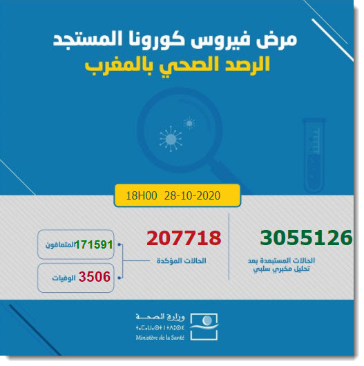وجاءت إحصاءات وزارة الصحة المغربية، على بوابتها الرسمية، حول مصابي فيروس كورونا خلال 24 ساعة، ليرتفع العدد الإجمالي لحالات الإصابة المؤكدة بالفيروس بالمملكة إلى 207.718 ألف حالة.