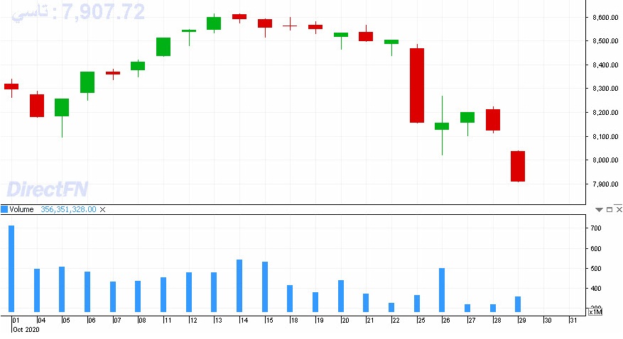 مباشر ـ ثابت شحاتة: شهد سوق الأسهم السعودية- تداول، أداء سلبيا خلال شهر أكتوبر / تشربن الأول 2020، ليعاود تراجعه بعد 6 أشهر من الارتفاعات المستمرة، ويسجل أول خسائر شهرية منذ مارس / آذار الماضي.