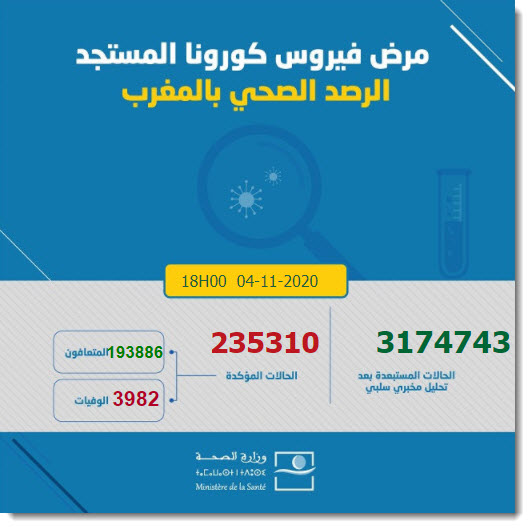 وجاءت إحصاءات وزارة الصحة المغربية، على بوابتها الرسمية، حول مصابي فيروس كورونا خلال 24 ساعة، ليرتفع العدد الإجمالي لحالات الإصابة المؤكدة بالفيروس بالمملكة إلى 235.31 ألف حالة.