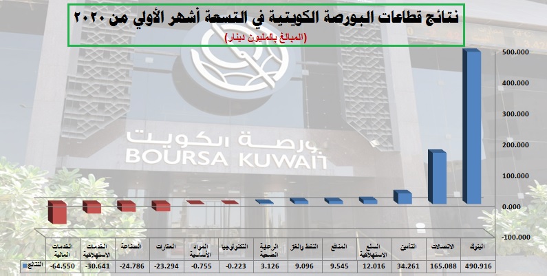 وطبقاً لمسح أعده "مباشر"، بلغت أرباح الشركات المُعلنة خلال الفترة 579.8 مليون دينار (1.9 مليار دولار)، مقابل أرباح بنحو 1.606 مليار دينار (5.27 مليار دولار) للتسعة أشهر المقابلة من عام 2019.