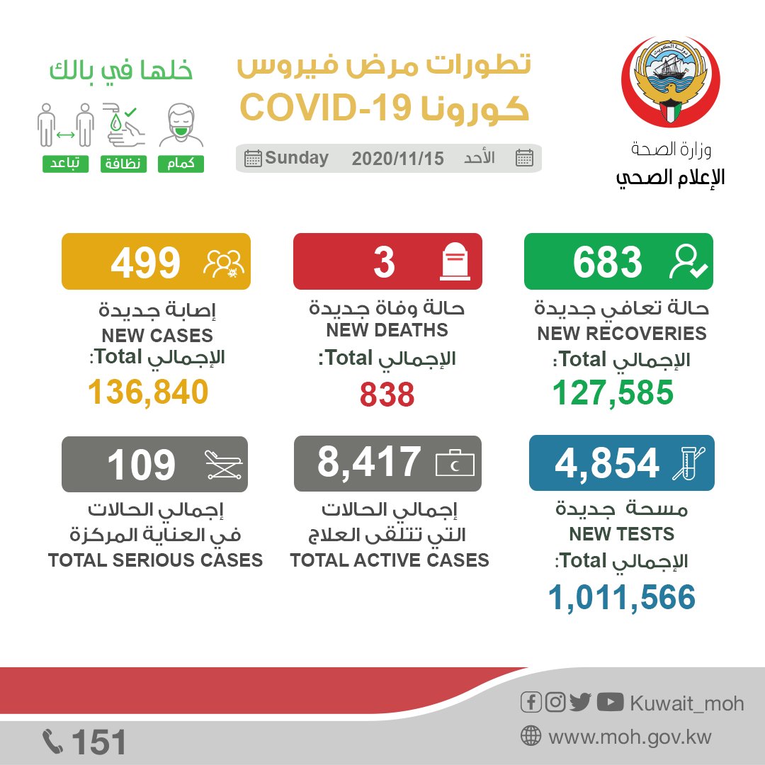 وسجلت الكويت اليوم عدد 3 حالات وفاة جديدة، ليرتفع عدد الوفيات الإجمالي في البلاد إلى 838 حالة.