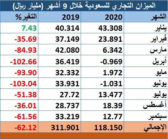 وسجل الفائض التجاري للسعودية انخفاضاً بنحو 62.1% خلال العام 2020 (يناير/ كانون الثاني إلى سبتمبر/ أيلول)، وبما يعادل 193.75 مليار ريال على أساس سنوي.