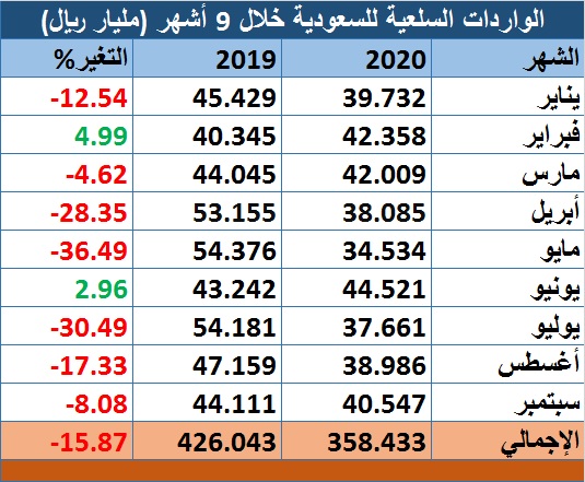 وانخفضت واردات المملكة في الـ9 أشهر الأولى من عام 2020 بنسبة 15.87%، وبما يعادل 67.61 مليار ريال عن الفترة المماثلة من العام الماضي.