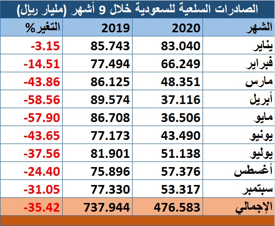 وبالنسبة لحركة الصادرات، شهدت انخفاضاً بنسبة 35.4% في أول 9 أشهر من عام 2020، وبتراجع قيمته 261.36 مليار ريال عن الفترة المماثلة من العام الماضي.