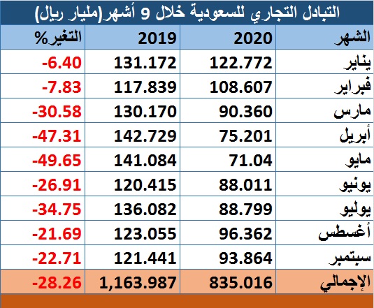 وسجل التبادل التجاري للمملكة العربية السعودية انخفاضاً نسبته 28.3% في الـ 9 أشهر الأولى من عام 2020، وبتراجع قيمته 328.97 مليار ريال عن الفترة المماثلة من العام الماضي.
