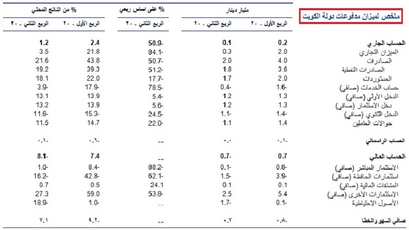 أشارت البيانات الأولية إلى تراجع فائض الحساب الجاري بالربع الثاني من 2020، الذي تأثر بصدمة مزدوجة تعرض لها النشاط الاقتصادي والمتمثلة في انخفاض أسعار النفط وتداعيات الجائحة.