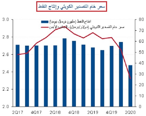 انكمش فائض الميزان التجاري للسلع إلى 0.3 مليار دينار فقط بالربع الثاني من 2020. وانخفضت عائدات تصدير النفط، التي تشكل قرابة 89% من إجمالي الصادرات، إلى النصف تقريباً لتصل إلى 1.8 مليار دينار مقارنة بـمستوياتها في الربع السابق نتيجة لانعكاس تداعيات جائحة كورونا على أسعار النفط، إذ انخفض سعر خام التصدير الكويتي إلى 25.8 دولار للبرميل في الربع الثاني من عام 2020 مقابل 52.1 دولار للبرميل بالربع الأول من 2020.