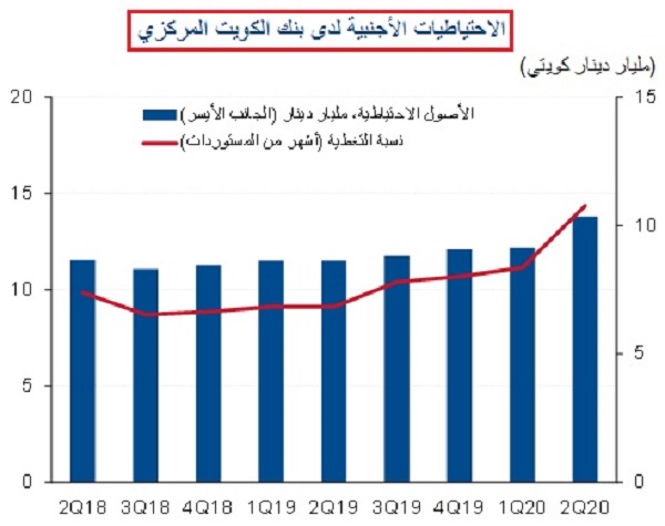 ارتفع إجمالي الأصول الاحتياطية الدولية لبنك الكويت المركزي بنحو 1.7 مليار دينار بالربع الثاني من 2020 ليصل إلى 14.0 مليار دينار بنهاية شهر يونيو أي بما يمثل نحو 38% من الناتج المحلي الإجمالي أو بما يكفي لتغطية 10.8 شهر من واردات السلع والخدمات.