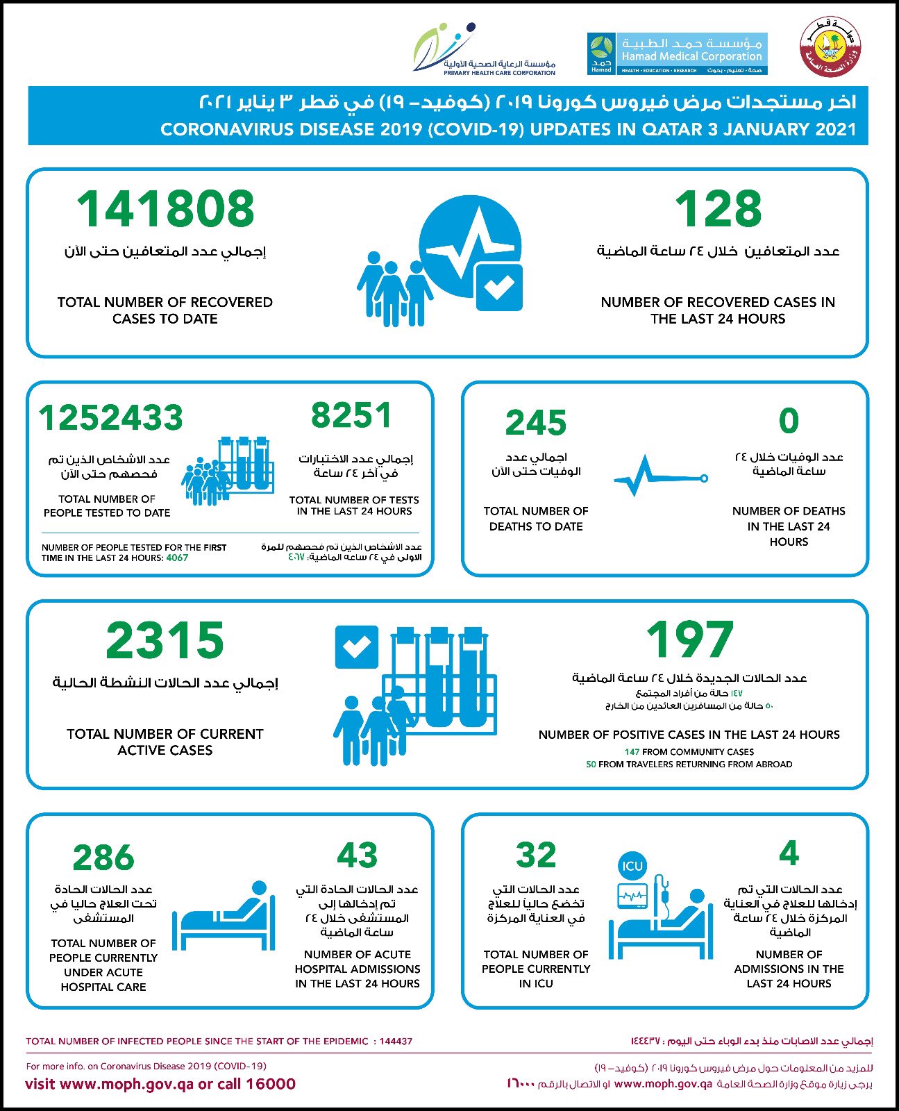 كما سجلت وزارة الصحة شفاء 128 شخصاً من الفيروس خلال الـ24 ساعة الماضية، ليصل بذلك العدد الإجمالي لحالات الشفاء في دولة قطر إلى 141.808 ألفاً.
