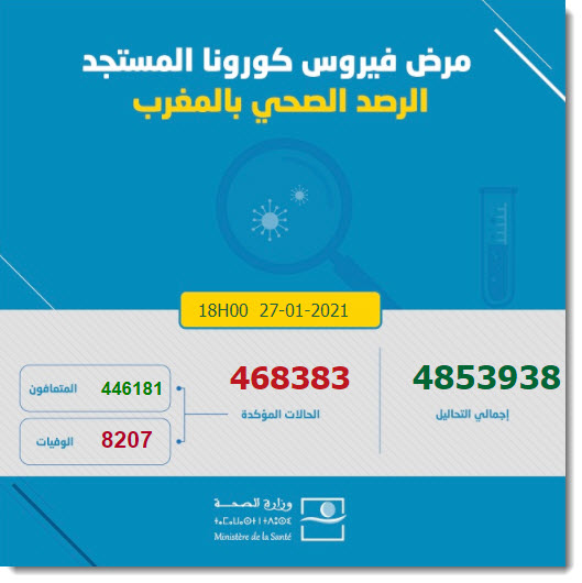وجاءت إحصاءات وزارة الصحة المغربية، على بوابتها الرسمية، حول مصابي فيروس كورونا خلال 24 ساعة، ليرتفع العدد الإجمالي لحالات الإصابة المؤكدة بالفيروس بالمملكة إلى 468.383 ألف حالة.