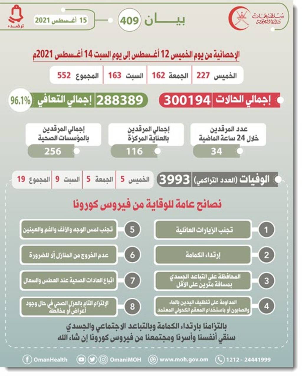 مباشر: سجلت وزارة الصحة العُمانية 552 حالة إصابة جديدة بفيروس كورونا "19-Covid" الوبائي في 3 أيام.