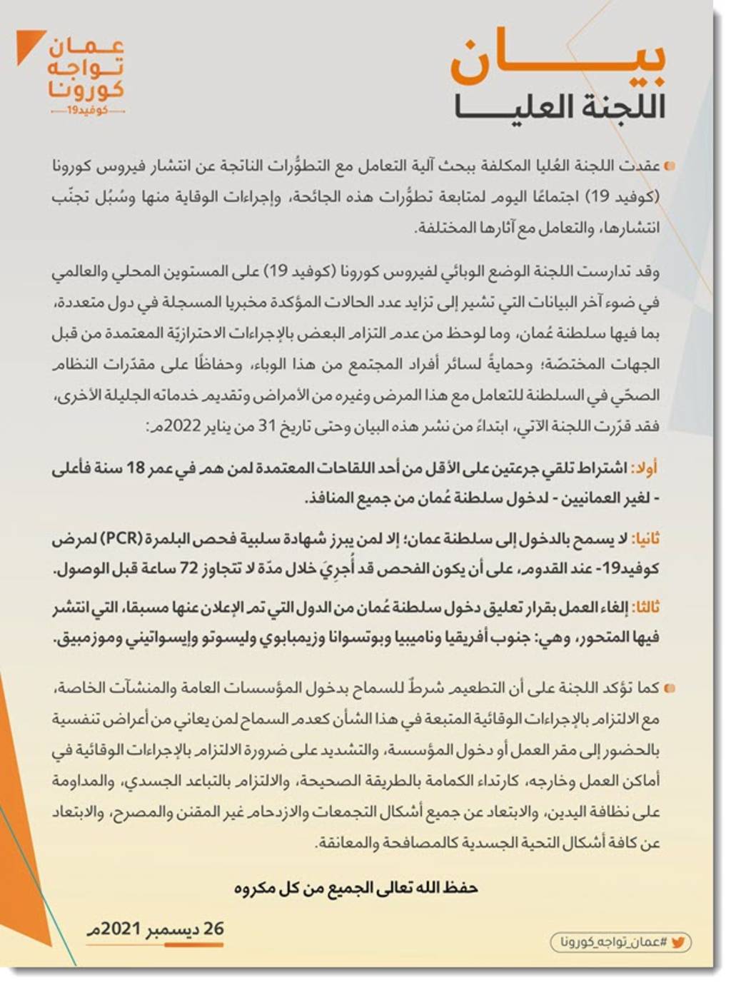واتخذت اللجنة كذلك قراراً باشتراط تلقي جرعتين على الأقل من أحد اللقاحات المعتمدة لمن هم في عمر 18 سنة فأعلى -لغير العمانيين- لدخول عُمان من جميع المنافذ.