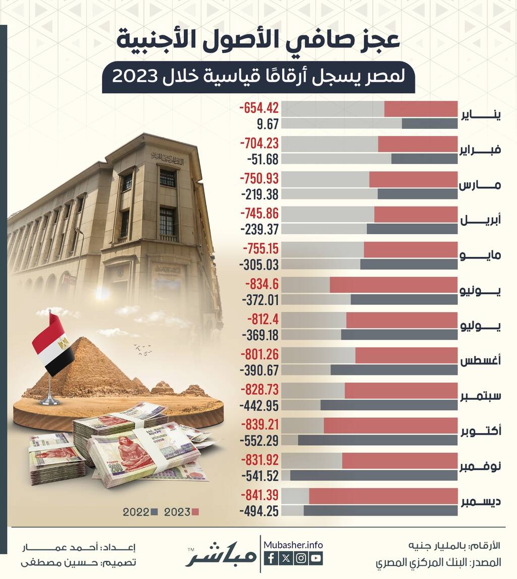 ويستعرض الأنفوغرافيك التالي، أبرز الأرقام عن عجز صافي الأصول الأجنبية لمصر خلال عامي 2022 و 2023: