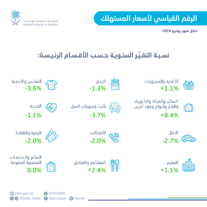 الرياض - مباشر: بلغ مؤشر الرقم القياسي لأسعار المستهلك في السعودية (معدل التضخم) 1.5 % في شهر يونيو/ حزيران 2024، مقارنة بـالشهر نفسه من العام 2023.