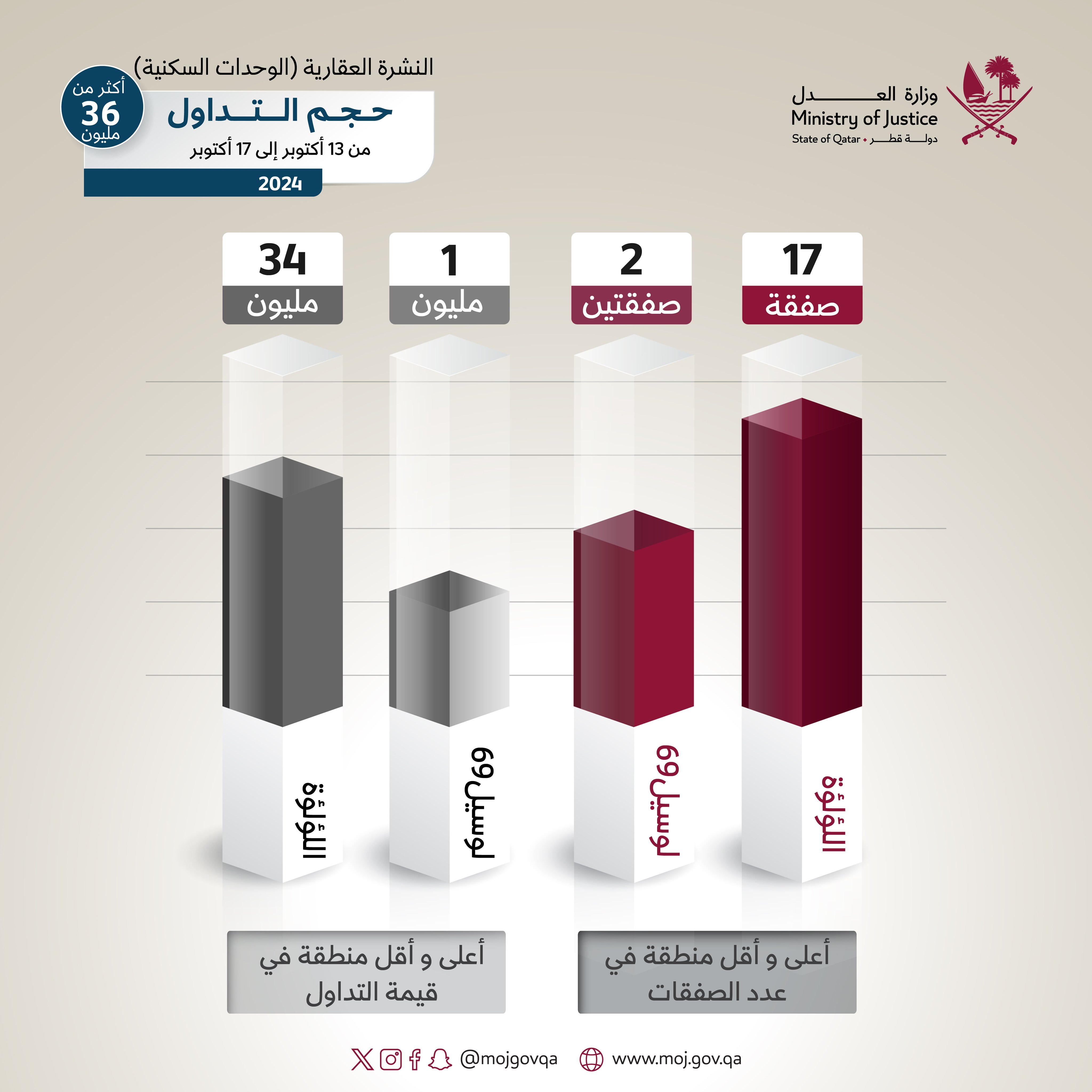 وكانت التداولات العقارية التي تشمل الوحدات السكنية سجلت في دولة قطر خلال الفترة من 6 إلى 10 اكتوبر/تشرين الأول 2024 بنحو 447.53 مليون ريال.
