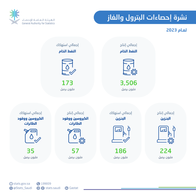 وبلغ استهلاك النفط الخام في المملكة 173 مليون برميل في عام 2023، مقابل 178 مليون برميل في العام السابق؛ لينخفض بنحو 2.8%.