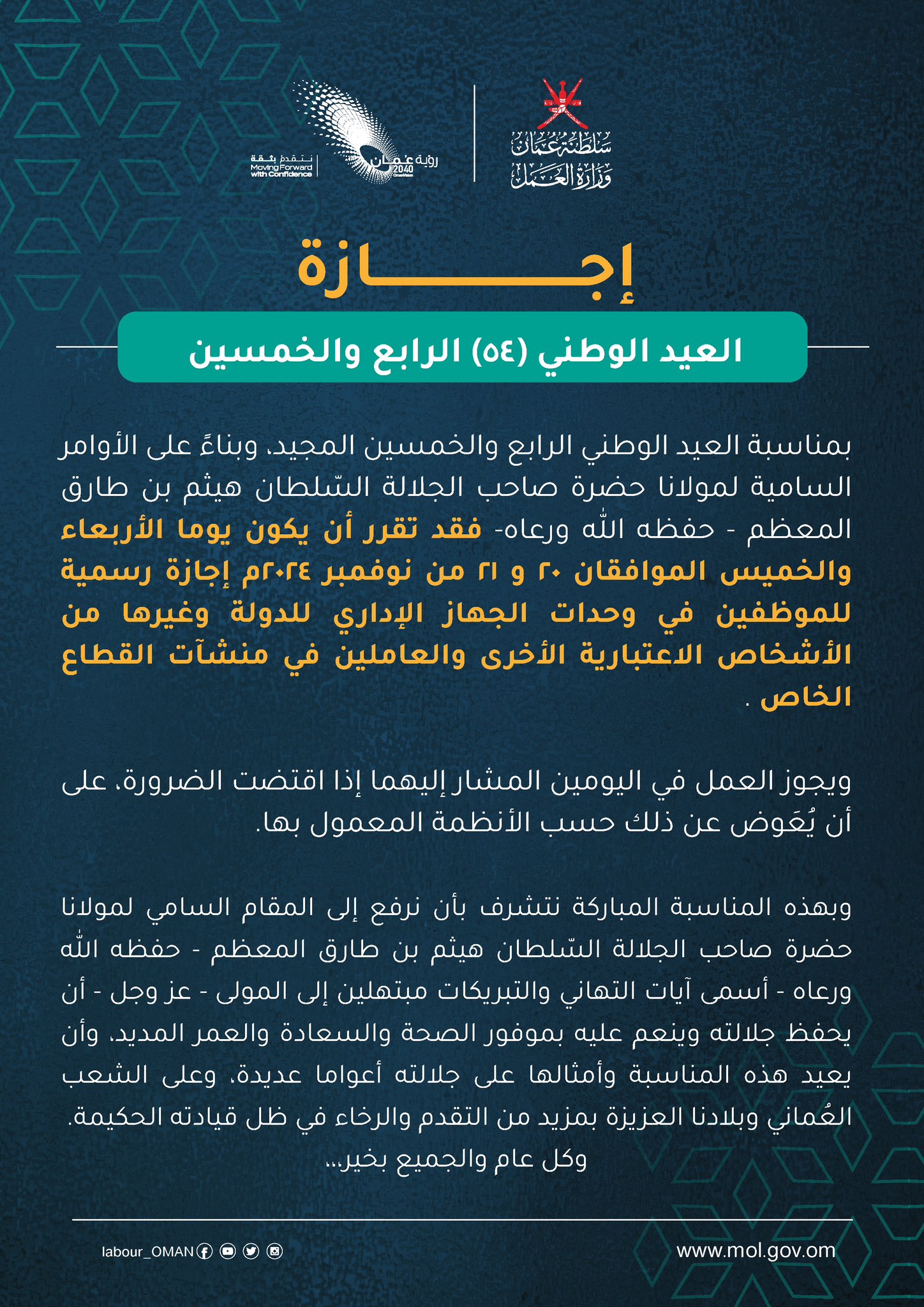 عُمان - مباشر: تبدأ غداً سلطنة عُمان عطلة العيد الوطني الـ 54 للقطاعين العام والخاص.