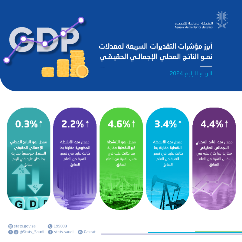 وأظهرت نتائج النشرة ارتفاع الناتج المحلي الإجمالي الحقيقي المعدَّل موسميّاً خلال الربع الرابع من عام 2024م بنسبة 3% مقارنةً بالربع الثالث من العام نفسه.