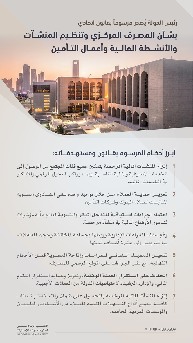 يأتي المرسوم بقانون اتحادي رقم (6) لسنة 2025 بشأن المصرف المركزي وتنظيم المنشآت والأنشطة المالية وأعمال التأمين، في إطار جهود دولة الإمارات المستمرة لتحديث الإطار التشريعي والرقابي للقطاع المالي، وتعزيز استقراره وكفاءته وقدرته التنافسية، وبما يرسخ تواؤم المنظومة الوطنية مع أرقى المعايير الدولية، ويُعزّز استقلالية المصرف المركزي ودوره المحوري في تحقيق الاستقرار المالي والنقدي.