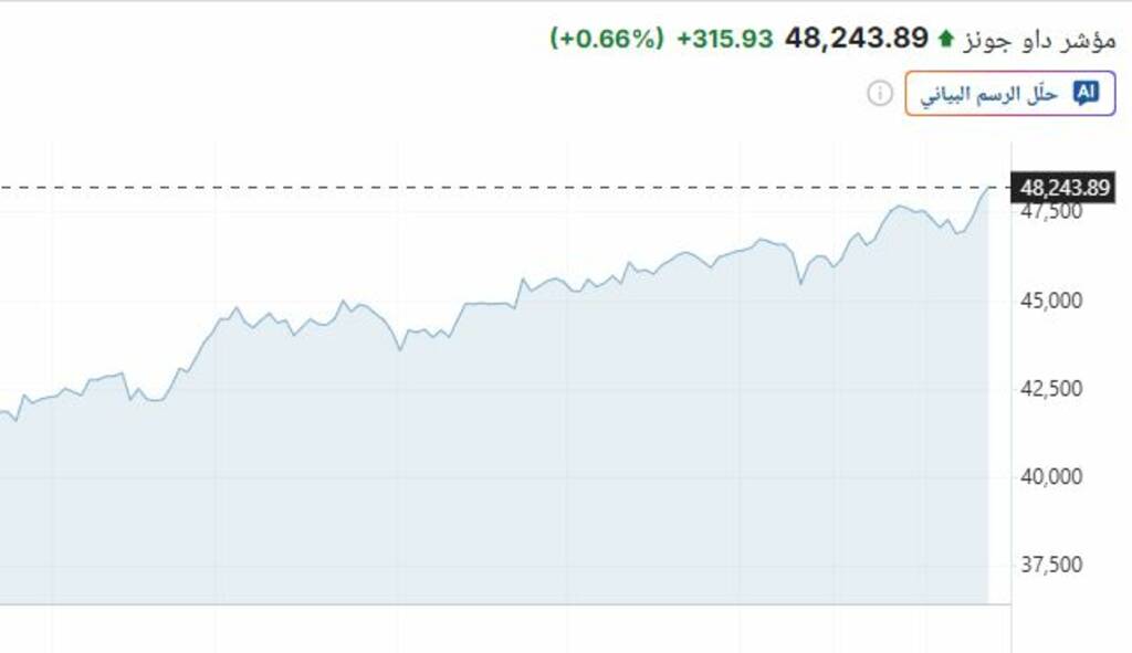 وصعد مؤشر "داو جونز" الصناعي بنسبة 0.65% أو 311 نقطة إلى 48239 نقطة، في تمام الساعة 05:35 مساءً بتوقيت مكة المكرمة، بعدما لامس مستوى قياسيًا جديدًا عند 48252 نقطة.